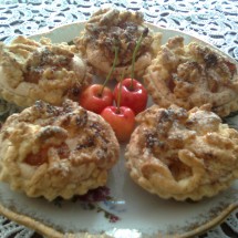 Białka ubić z cukrem dodać olej i budyń. Wypełnić podpieczone babeczki, włożyć wydrążone czereśnie i zetrzeć na wierz resztę ciasta, posypać cukrem i cynamonem. Piec jeszcze przez ok. 10-15 min, do czasu aż się zrumienia.