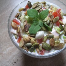 Schab kroimy w kostkę. Pomidory, ogórki i schab mieszamy i większym naczyniu. Dodajemy koperek i syrop miętowy. Mieszamy. Na koniec dodajemy zimną maślankę. Sól i pieprz do smaku.