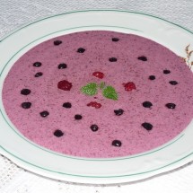 2. Chłodnik rozlewamy na zimne talerze, posypujemy odłożonymi wcześniej owocami. Podajemy od razu po przygotowaniu, z młodymi ziemniakami lub zwiniętymi w ,,rulonik” (bez nadzienia) naleśnikami.