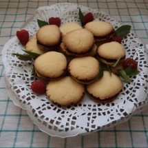 Wyjmij je na tacę i odstaw do ostygnięcia. Po tym czasie połowę upieczonych ciasteczek posmaruj dżemem malinowym i przykryj pozostałymi krążkami.