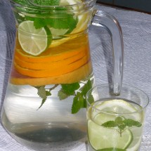 Przelać mocno schłodzona wodę do dzbanka i włożyć po kilka plastrów pomarańczy, cytryny, limonki, grejpfruta i mandarynki. Wlać sok z krojenia owoców. Udekorować listkami mięty lub melisy. Dodać kostki lodu i od razu podawać.