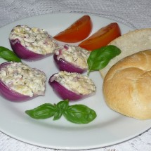 Cytrynę umyć, otrzeć skórkę i wycisnąć sok. Fetę utrzeć na gładką pastę z jogurtem i sokiem z cytryny. Dodać parmezan, posiekaną cebulę, skórkę z cytryny i listki tymianku. Farsz doprawić przeciśniętym przez praskę czosnkiem, pieprzem i solą. Wydrążone połówki cebul napełnić masą serową, ułożyć na tacce aluminiowej i piec około 15 minut.