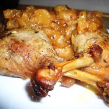 Nóżki przykrywamy owocami, posypujemy ziołami i przyprawami, wstawiamy do nagrzanego do ok 200*C piekarnika i pieczemy ok godzinę.