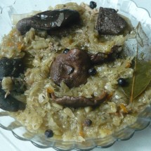 • Namoczone grzyby zagotuj w wodzie, w której się moczyły i wlej je razem z wywarem do kapusty. Gotuj razem aż grzyby i kapusta będą miękkie.