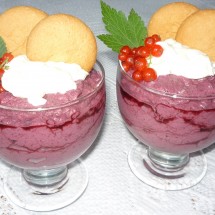 Serek mascarpone zmiksuj w osobnym naczyniu ze szklanką śmietany i połową porcji cukru pudru. Dodaj mus jagodowy, miksuj razem jeszcze 2-3 minuty. Powstały krem rozłóż do czterech pucharków. Wstaw do lodówki na co najmniej godzinę, aby masa dobrze się schłodziła.