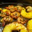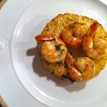Na drugą patelnię na bardzo rozgrzane sklarowane masło pół na pół z oliwą wrzucamy krewetki i je opiekamy. Po czym opieczone przerzucamy na ananasy, i wszystko posypujemy cypryjską czarną solą, chwilę razem smażymy, żeby przeszły sobą smaki z obu patelni.