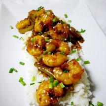Czosnek i szalotkę obrać i posiekać drobno. Krewetki oczyścić z ogonków, opłukać i osuszyć na ręczniku papierowym. Na patelni rozgrzać oliwę i podsmażyć czosnek i szalotkę. W misce wymieszać ocet ryżowy, sos sojowy, olej sezamowy, miód i słodką paprykę. Na patelnię dodać krewetki i smażyć około 2 minuty. Wlać sos i mieszając dusić jeszcze chwilę. Wsypać fasolkę, wymieszać i podgrzewać jeszcze minutę. Zdjąć z ognia, ryż odcedzić, nałożyć na talerze, na to krewetki. Całość posypujemy sezamem i szczypiorkiem.