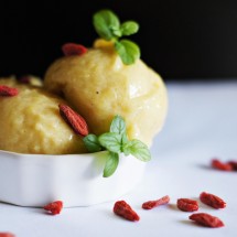 Lody podałam w miseczkach, posypane jagodami goji i udekorowane liśćmi mięty.