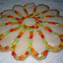 4. Cukier puder utrzyj z resztą soku z cytryny i ,ewentualnie, odrobiną wody. Polukruj mazurek. Ozdób owocami, skórką pomarańczową i pokrojoną galaretką.