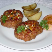 Z mięsa uformować kotlety, w każdym zrobić zagłębienie i napełnić je farszem. Kotlety układać na folii aluminiowej i zawinąć. Opiekać kotlety na grillu 20 minut.