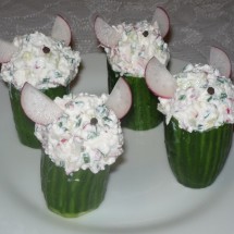 Porcjami przygotowanej sałatki twarożkowej napełnij ogórkowe tuby. Udekoruj wedle uznania, od razu podawaj.