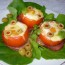 WYKONANIE: 1. Pomidory umyj, osusz. Poodcinaj wierzchy. Łyżeczką ostrożnie wydrąż środki. Takie pomidorowe miseczki ustaw do góry dnem, aby dobrze spłynął cały sok. 2. W tym czasie na oleju wysmaż na chrupko plastry szynki....