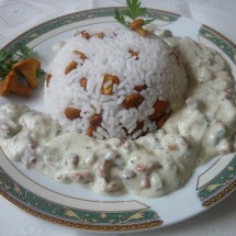 • Kilka kurek odłożyć i wymieszać z ryżem. Resztę zalać śmietaną i doprawić do smaku.