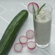 • Ogórek, rzodkiewki i szczypiorek pokrój na kawałki. Wszystko zmiksuj razem z maślanką i siemieniem. Na koniec dopraw do smaku solą i pieprzem.