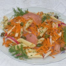 • Plasterki wędzonego łososia podziel na mniejsze kawałki. Dodaj do warzyw razem z wystudzonym makaronem. Umyj po kilka łodyg koperku i szczypiorku, posiekaj. Kapary osącz.