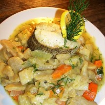 Najpierw sprawiamy i kroimy na dzwonki rybę, potem należy obrać włoszczyznę, umyć i pokroić w kawałki ( kształt zależy od fantazji). Włoszczyznę przesmażamy na maśle z oliwą i zalewamy winem. Odparowujemy płyn do połowy i zalewamy wywarem, układamy na wierzchu dzwonka ryby,liście laurowe i ziarna pieprzu. Garnek przykrywamy i dusimy 20-25 min ( czas zależy od wielkości kawałków ryby). Do zrobienia szarych klusek należy obrać, umyć i zetrzeć na tarce ziemniaki. Trzeba je odcisnąć a sok odstawić w miseczce na bok. Po chwili sok z ziemniaków rozwarstwi się, klarowny płyn z wierzchu trzeba delikatnie wylać a krochmal z dna wymieszać z pozostałymi składnikami. Powinna wyjść dość zwarta masa. Masę tę kładziemy na talerzu robiąc płaski ok 2cm. placek. Łyżką do garnka z gotującą się osoloną wodą zgarniamy porcje masy od czasu do czasu mieszając. kluski powinny się gotować 2-3 min. licząc od wypłynięcia na wierzch.