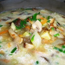 W drugim garnku o grubym dnie na maśle z oliwą podsmażamy pokrojone w plasterki luk cząstki pieczarki i cebulę. Kiedy się zarumienią dodajemy drobno pokrojony lub wyciśnięty przez praskę czosnek.