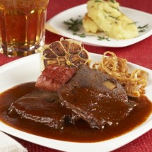 Cebulę kroimy drobno i na części tłuszczu podsmażamy na złoty kolor. Plastry mięsa lekko zbijamy i z obu stron płytko nadkrajamy, aby podczas pieczenia nie skręcały się. Mięso solimy, przyprawiamy pieprzem, obtaczamy w mące i kładziemy na cebulę. Dodajemy przecier pomidorowy, zalewamy piwem i wolno dusimy do miękkości. Miękkie mięso dzielimy na porcje, do każdej dodajemy podsmażone plastry cebuli i opieczoną parówkę. Mięso polewamy sosem z piwa i przecieru.