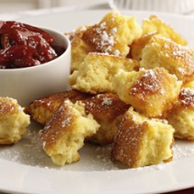 Podawać od razu z cukrem pudrem i konfiturą śliwkową.