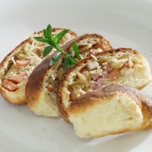 Potem je rozwałkowujemy i dzielimy na kwadraty, które napełniamy mieszanką złożoną z podsmażonego mięsa wędzonego, kiełbasy, cebulki, kapusty i czosnku. Zawijamy, wkładamy do natłuszczonej brytfanny i pozostawiamy jeszcze do wyrośnięcia. Nacieramy olejem, posypujemy sezamem i pieczemy w nagrzanym piekarniku do zarumienienia.