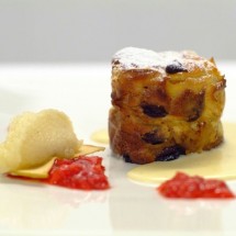 Sorbet przygotujemy z jednej trzeciej obranych jabłek. Wkładamy je do rondelka, dodajemy laskę cynamonu i glukozę. Zalewamy około 50 ml wody, zagotowujemy i natychmiast schładzamy, na około 2 °C. Dodajemy rum i zamrażamy do temperatury -22 °C. Po zamrożeniu ścieramy grubo w paco jet. Przecier ponownie mrozimy, następnie ubijamy w paco jet.