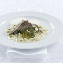 Cebulę kroimy drobno, spieniamy na maśle i zalewamy śmietaną i wywarem, po czym zagotowujemy. Sos przyprawiamy pokrojonym w kostkę ogórkiem, solą i białym pieprzem. Zagotowujemy i podajemy z gotowanym mięsem wołowym i knedlami bułczanymi.