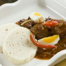 Gotowy gulasz w razie potrzeby zagęszczamy miękiszem chleba. Pokrojoną słoninę podsmażamy, dodajemy pokrojoną paprykę i seler, ogrzewamy i zdobimy jajkiem porcję gulaszu.