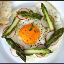 Jajka doprawić solą i pieprzem ziołowym. Wyłożyć na talerze, udekorować szparagami i rzodkiewką, podawać z pieczywem.
