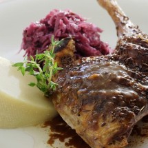 Kaczka na miodzie i winie z kapustą i ziemniaczanym knedlem czosnkowym