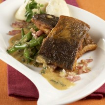 Każdy kawałek ryby szpikujemy wąskimi paskami słoniny. Nacieramy mieszanką soli, roztartego czosnku i pieprzu.