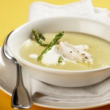 Z masła i mąki przygotowujemy jasną zasmażkę, którą przyprawiamy, zalewamy wywarem z piersi kurczaka i wywarem ze zmiksowanymi szparagami. Dobrze zagotowujemy i odcedzamy.