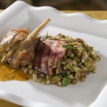 Groch i kaszę mieszamy. Do natłuszczonej brytfanny kładziemy na przemian kawałki królika i warstwę grochu z kaszą. Zalewamy nieprzecedzonym sosem, w którym dusiliśmy królika. Królika przykrywamy warstwą grochu z kaszą.