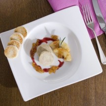 Na talerzach rozkładamy najpierw plasterki jabłek, dodajemy pasztet, kostki jabłek i na koniec kilka kropli sosu, pędy groszku lub zielone zioła.