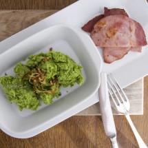 Młody groszek podlewamy wywarem z mięsa wędzonego, przyprawiamy solą i pieprzem. Z masła i mąki robimy zasmażkę, dodajemy do groszku. Razem dusimy a następnie ugniatamy.