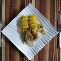 Pieczony kurczak z jabłkami w delikatnym sosie jałowcowym