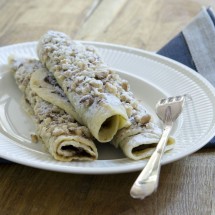 Na koniec smarujemy powidłami, rolujemy i obtaczamy w mieszance gniecionych orzechów z cukrem.