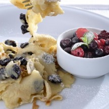Na rozpuszczone na patelni masło nalewamy poszczególne porcje, które posypujemy posiekanymi migdałami. Przy odwracaniu ciasto rwiemy, posypujemy cukrem i karmelizujemy.