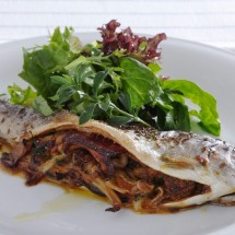 Cebulę, czosnek i grzyby kroimy na grube plastry. Cebulę z czosnkiem podsmażamy na maśle, dodajemy grzyby, krótko podsmażamy i dodajemy posiekane zioła – lubczyk i pietruszkę. Doprawiamy pieprzem, tartym kminkiem, szczyptą mielonej papryki, solimy, dokładnie mieszamy i pozostawiamy do wystygnięcia. Pstrąga solimy, do jamy brzusznej wkładamy plaster słoniny i nadzienie grzybowe. Z wierzchu jeszcze posypujemy pieprzem i kminkiem, i pieczemy w piekarniku około 20 minut.