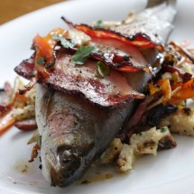 Pstrąg nadziewany warzywami, z kluskami ziemniaczanymi
