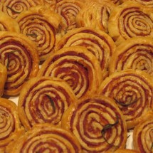 Przygotowany rulon z ciasta z szynką w środku kroimy w roladki o grubości 1 – 2 cm, układamy je na blasze wyłożonej folią aluminiową i posypanej mąką. Każdą roladkę smarujemy roztrzepanym jajkiem, a na wierzch kładziemy igiełkę rozmarynu. Aby po upieczeniu rozmaryn był chrupiący, wystarczy skropić go oliwą. I gotowe. Blachę z roladkami wstawiamy do rozgrzanego piekarnika na ok. 15 - 20 minut i pieczemy aż roladki będą rumiane.