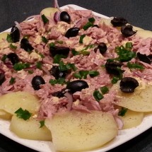 Ugotowane ziemniaki pokroić w plasterki ok. 0,5 cm. Ułożyć na półmisku w rozetkę. Na ziemniaki wyłożyć odsączonego tuńczyka. Rozrzucić pokrojoną w cienkie piórka czerwoną cebulę i kilka czarnych oliwek.
