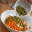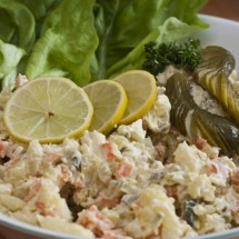 Marchew i seler obieramy i w wodzie z dodatkiem soli i octu gotujemy 10–15 minut, aby warzywa były miękkie, ale nie rozgotowane. Wyjmujemy z wody, pozostawiamy do wystygnięcia i drobno kroimy. Kroimy w kostkę także ogórki, marynatę wykorzystamy pod koniec przyrządzania sałatki. Groszek z puszki odcedzamy (mrożony rozmrażamy). Wszystkie pokrojone składniki delikatnie mieszamy w misce, dodajemy majonez i trochę marynaty z ogórków. Solimy i doprawiamy pieprzem.