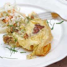 Na smalcu podsmażamy słoninę, kostki chleba i kawałki serków, zalewamy roztrzepanymi jajkami, solimy, dodajemy pieprz i zapiekamy.
