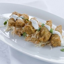 150 g piersi z kurczaka solimy, posypujemy pieprzem. Rozdzielamy na 8 kawałków i każdy z nich obtaczamy w cieście. Wkładamy na rozgrzany olej, który nie powinien mieć ponad 150 stopni i smażymy.
