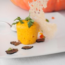 Masło utrzeć z żółtkami, dodać dynię, bułkę i płatki oraz oliwę. Przyprawić do smaku.