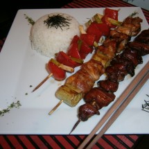 Szaszłyki układamy na grillu i grillujemy ok. 12 minut, pamitająco o częstym przewracaniu i smarowaniu pozostałą marynatą.