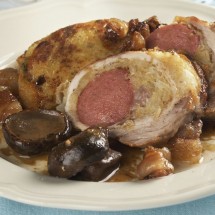Plastry mięsa zbijamy dokładnie, solimy, przyprawiamy i rozkładamy na nich kapustę. Dodajemy parówkę, zawijamy i powstały zwitek spinamy wykałaczką. Zwitki obtaczamy w mące i krótko opiekamy na oleju.