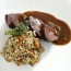 Udziec dzielimy na dwa kształtne kawałki, które szpikujemy czosnkiem i słoniną, przyprawiamy solą, pieprzem i ze wszystkich stron opiekamy na smalcu, dodajemy pokrojoną w drobną kostkę szalotkę i gałązkę tymianu, podlewamy wodą lub...